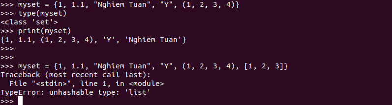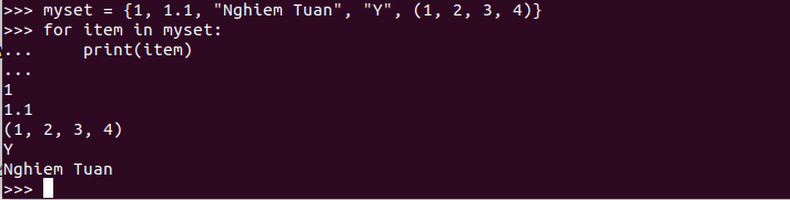 myset = {1, 1.1, "Nghiem Tuan", "Y", (1, 2, 3, 4)}