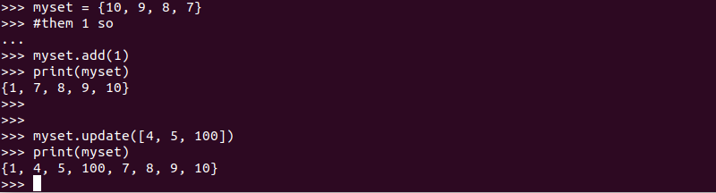 Chúng ta không thể thay đổi các phần tử có trong Set vì không có thứ tự. Nhưng chúng ta có thể thêm một phần tử vào trong set bằng cách sử dụng hàm add()- thêm 1 phần tử, và thêm nhiều phần tử bằng cách sử dụng hàm update():