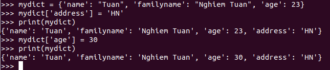 mydict = {'name': 'Tuan', 'familyname': 'Nghiem Tuan', 'age': 23, 'address': 'HN'}