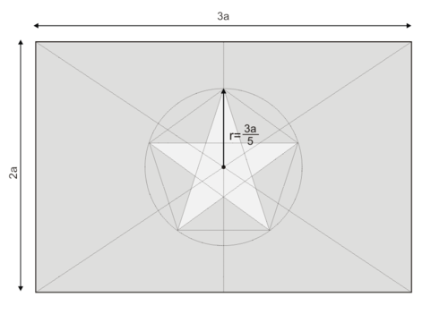 Okay, vậy đề bài là: chiều dài lá cờ là 3a, chiều rộng là 2a, bán kính đường tròn ngoại tiếp của ngôi sao vàng là 3a / 5 (tức là bằng 1 / 5 chiều dài). Bắt đầu thôi