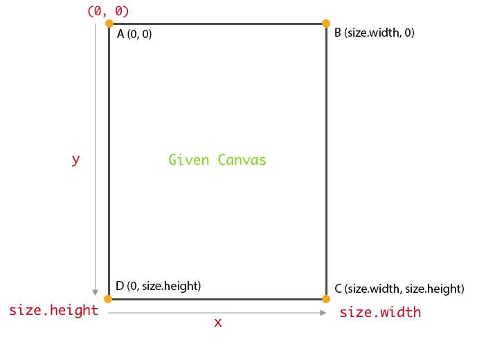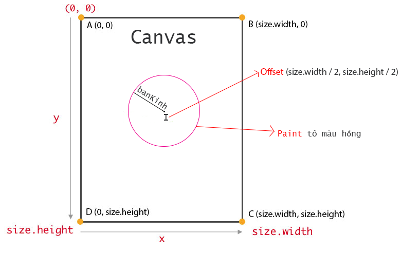 shouldRepaintgiúp chúng ta quyết định có nên vẽ lại cái CustomView này hay không. Khi nó vẽ lại nó sẽ chạy lại hàmpaint. Nếu returntruethì nó sẽ vẽ lại, returnfalsethì không vẽ lại Offsettruyền vào hoành độ x, tung độ y. Một objectOffsetđại diện cho một điểm trong hệ tọa độ Descartes (Đề - Các) mà các bạn đã học trong Toán ấy. Ngoài ra, nó còn có thể đại diện cho tọa độ của mộtvectortrong Toán.- Khác với hệ tọa độ Đề - Các mà chúng ta được học khi xưa, hệ tọa độ trong Flutter nó quy ước chiều dương của trục tung là hướng xuống và gốc tọa độ mình đặt tên là điểm A (0, 0) sẽ được quy ước ở vị trí đó. Từ điểm A (0, 0) đó, ta dễ dàng suy ra 3 điểm còn lại là B (size.width, 0), C (size.width, size.height) và D (0, size.height). Đây là 4 điểm cực kỳ quan trọng giúp chúng ta xác định được tọa độ của các điểm, các hình cần vẽ trong canvas