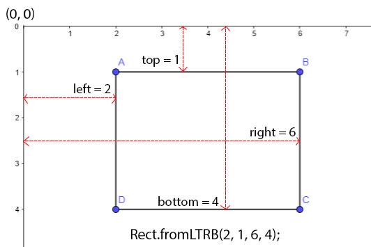 Tiếp theo, ta sẽ cần vẽ cái lá cờ đỏ. Tạo một redPaint và dùng hàm drawRect để vẽ hình chữ nhật màu đỏ. Hàm drawRect cần truyền vào một object Rect (hình chữ nhật). Để tạo một object Rect ta sử dụng hàm Rect.fromLTRB(double left, double top, double right, double bottom). Trong đó left, top, right, bottom là khoảng cách tính từ trục hoành hay trục tung như thế này: