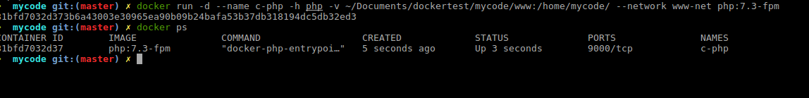 docker run -d --name c-php -h php -v ~/Documents/dockertest/mycode/www:/home/mycode/ --network www-net php:7.3-fpm