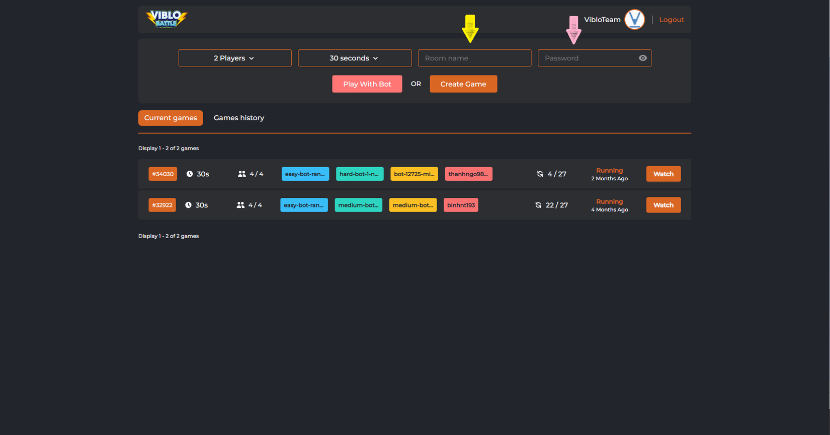 Người chơi cũng có thể đặt tên phòng (mũi tên vàng) và đặt mật khẩu (mũi tên hồng) cho phòng chơi của mình.