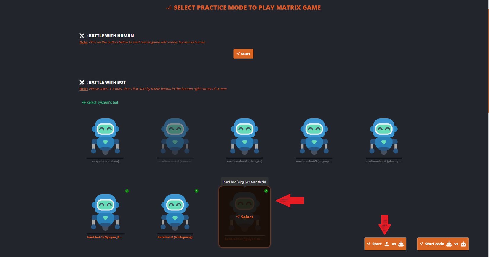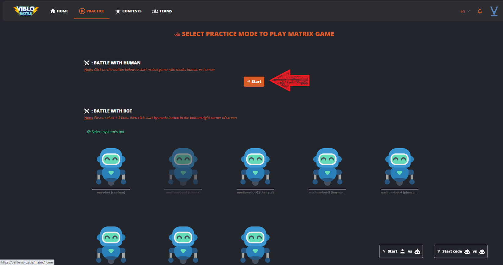 Game Matrix trên Viblo Battle có 3 hạng mục: Human vs Human, Human vs Bot và Bot vs Bot. Người chơi có thể tham gia luyện tập tại: https://battle.viblo.asia/practice/VolejRejNm/matrix/select-mode.