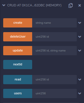 Tiếp tục giải thích code, ta tạo 1 Contract có tên Crud. Khai báo 1 biến cấu trúc User có 2 thuộc tính id, name. Ta khai báo 1 mảng users chứa các phần tử là biến cấu trúc User. Tiếp theo, tạo 1 biến integer là nextId để thêm 1 User vào mảng (ta dùng từ khóa uint để định nghĩa kiểu integer).