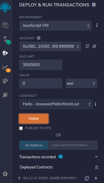 Để deploy, sau khi compile thành công, ta chọn tab icon Deploy. Tại phần environment, ta chọn môi trường máy ảo là Javascript VM, khi đó phần account bên dưới sẽ có những tài khoản chứa 100 Ether. Ether ở đây chính là đơn vị tiền kĩ thuật số của mạng lưới Ethereum.