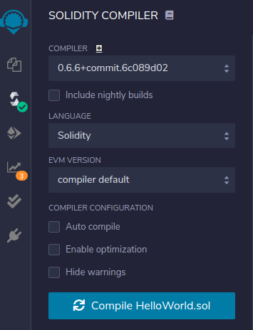 Để biên dịch, ta chọn vào tab chứa icon của Solidity, nhấn Compile HelloWorld.sol, nếu biên dịch đúng sẽ xuất hiện tích xanh. Hoặc có thể tích vào ô Auto Compile để không phải compile lại mỗi khi sửa đổi code.