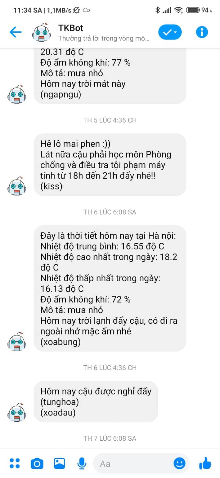 Tùy vào sự sáng tạo mà có thể viết được Bot có chức năng khác nhau, ở đây mình có viết thêm chức năng báo thời tiết nữa.