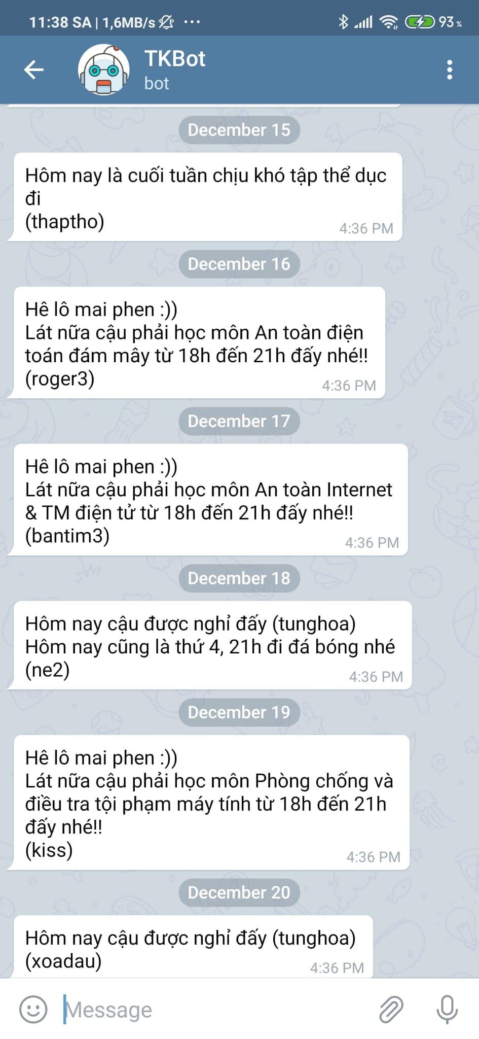 Thế rồi mình nảy ra ý định viết một con Chat Bot nhắc lịch học chạy hàng ngày để không phải bận tâm hôm nay học môn gì nữa.Tuy nhiên khi ấy lập trình cũng chưa thạo, biết bập bẹ ít javascript thôi, nên việc viết một con ChatBot rồi deploy lên server là một điều mà mình không thực sự nghĩ đến. Trong số các pro trong lớp thì có một cậu bạn viết bằng Google Script đồng thời cũng demo luôn cho mình cách hoạt động, thế là mình ngộ ra bao nhiêu chân lý, cuối cùng tìm hiểu và đã làm được