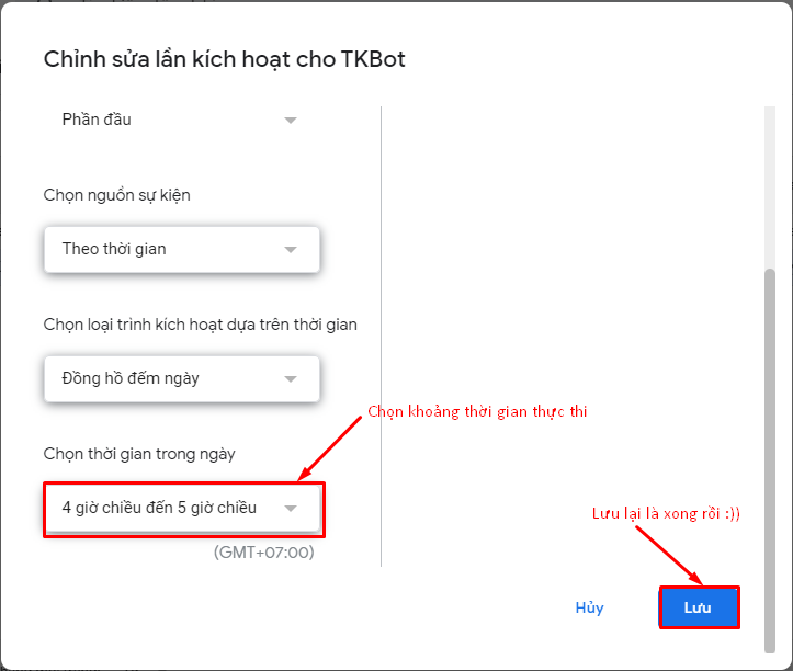 Cuối cùng là việc setting cho function của mình chạy hàng ngày vào một khung giờ nhất định
