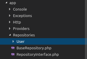 Ở đây mình tạo ra 2 file trong thư mục Repositories cùng cấp với thư mục User và Category như ở phần 2 mình đã thiết kế với tên lần lượt là BaseRepository.php và RepositoryInterface.php.