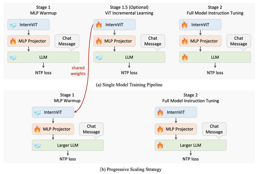 Pipeline huấn luyện được thiết kế thành ba giai đoạn nhằm nâng cao khả năng nhận thức hình ảnh và xử lý đa phương thức: