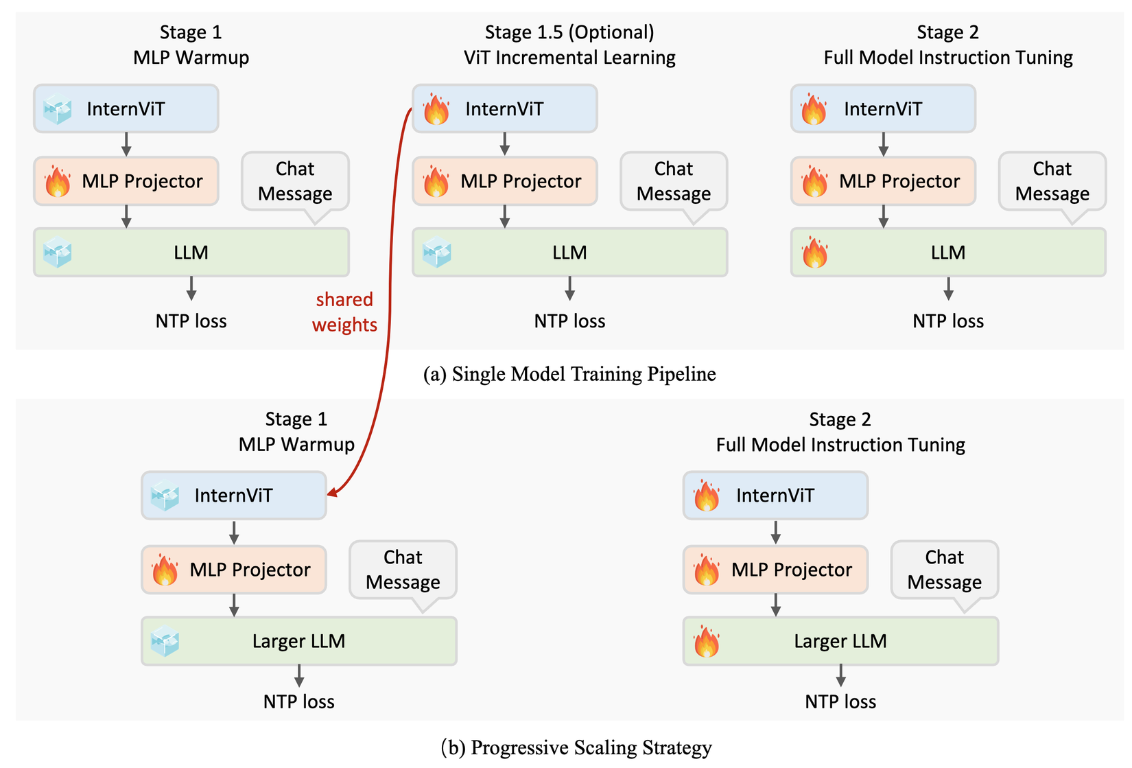 Giai đoạn 1.5: Học tăng cường ViT (ViT Incremental Learning) (Tùy chọn). Giai đoạn này cho phép huấn luyện bổ sung bộ mã hóa hình ảnh (ViT - Vision Transformer) cùng với bộ phận MLP bằng cách sử dụng cùng dữ liệu như ở Giai đoạn 1. Mục tiêu là cải thiện khả năng trích xuất đặc trưng hình ảnh, giúp mô hình nắm bắt thông tin toàn diện hơn, đặc biệt trong các lĩnh vực dữ liệu ít được đại diện như OCR đa ngôn ngữ và biểu đồ toán học. Sau khi được huấn luyện, bộ mã hóa này có thể được tái sử dụng với các mô hình ngôn ngữ lớn khác mà không cần huấn luyện lại, làm cho giai đoạn này trở thành tùy chọn trừ khi có sự giới thiệu các lĩnh vực mới.