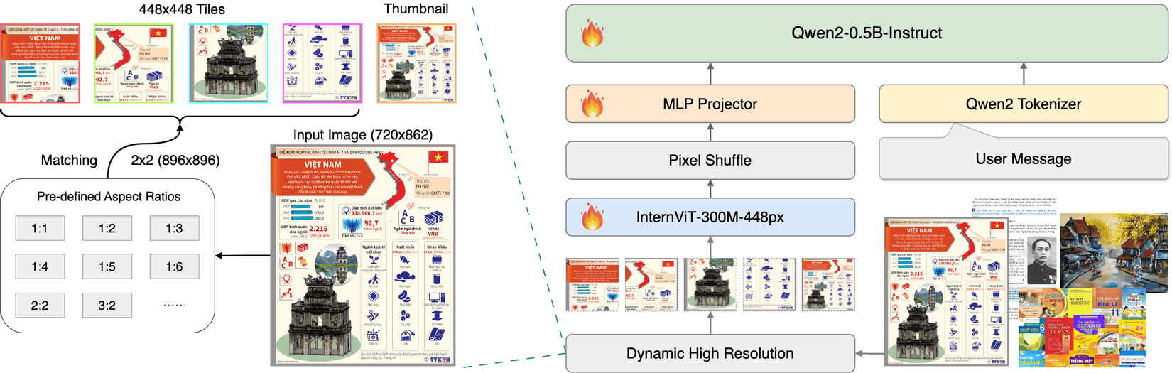 Hình ảnh đầu vào được xử lý bởi mô-đun Độ phân giải Cao Động (Dynamic High Resolution), trong đó hình ảnh được chia thành các phần nhỏ có kích thước 448x448 pixel cùng với một ảnh thu nhỏ (thumbnail). Các phần hình ảnh này sau đó được đưa vào mô hình InternViT-300M-448px để trích xuất đặc trưng thị giác. Một bước xáo trộn điểm ảnh (Pixel Shuffle) cũng được áp dụng trước khi truyền dữ liệu vào bộ chiếu MLP (MLP projector) nhằm căn chỉnh với các embedding của mô hình ngôn ngữ lớn Qwen2-0.5B-Instruct. Mô hình này tiếp nhận các token thị giác đã được căn chỉnh cùng với câu hỏi liên quan và tạo ra câu trả lời tương ứng.