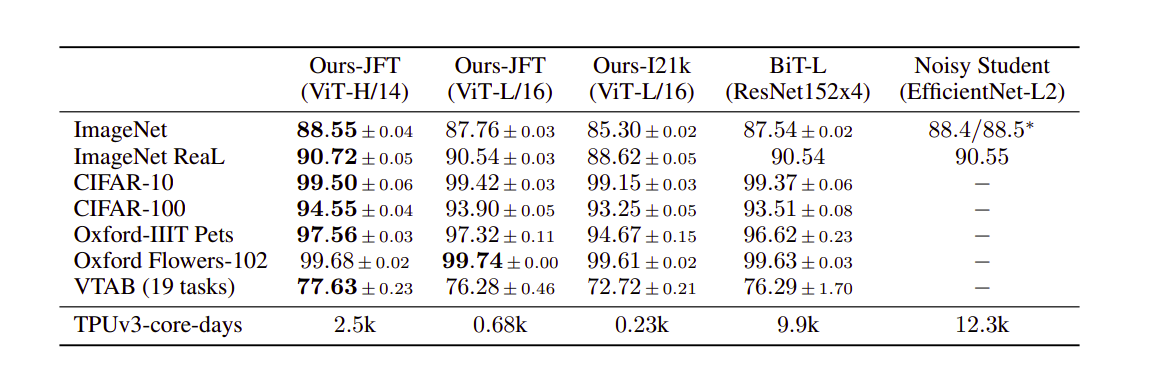 Kết quả thí nghiệm cho thấy, mô hình nhỏ hơn VIT-L/16 có pretrain trên tập JFT-300M đã đạt kết quả vươt trội BIT-L. Trong khi đó mô hình lớn hơn là VIT-H/14 cải thiện độ chính xác đáng kể đặc biệt trong những bộ dữ liệu thử thách như ImageNet, CIFAR-100, ...