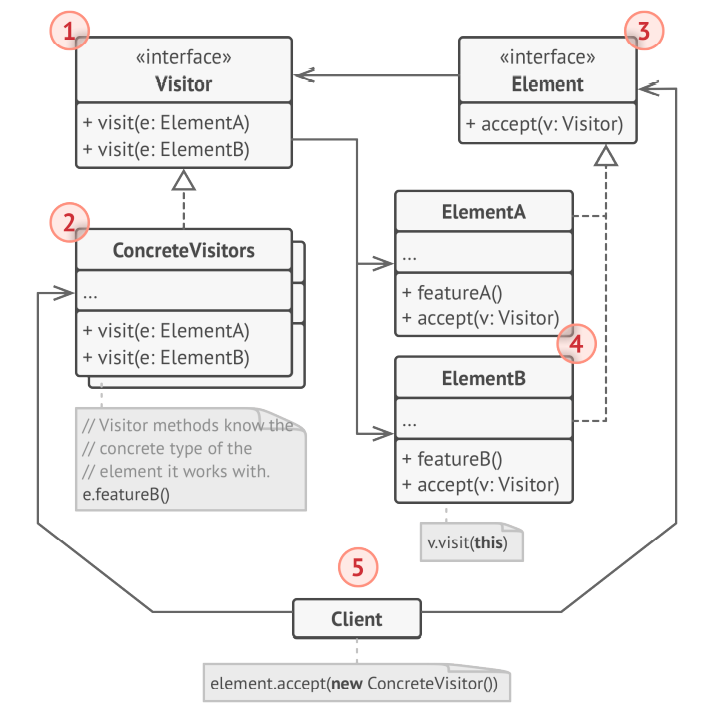 - Element interface khai báo một phương thức để "chấp nhận" các visitor. Phương thức này phải có một tham số được khai báo với kiểu là visitor interface.