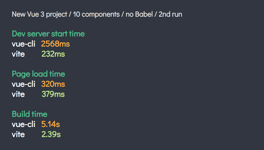 Đợt tết vừa rồi nghỉ ở nhà chán quá mình cũng đã nghiền ngẫm quả Vue Toronto 2020 mục Vite do anh Evan You cầm mic =))) Giới thiệu sơ bộ thì có cho ra 1 thống kê về tốc độ giữa Vue-CLI ( Based on webpack ) với Vite như dưới ảnh sau