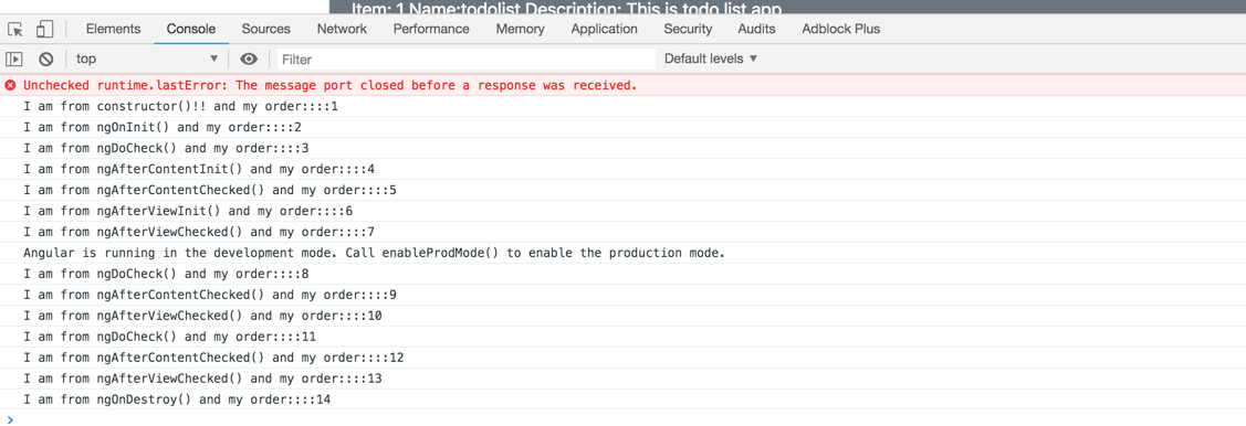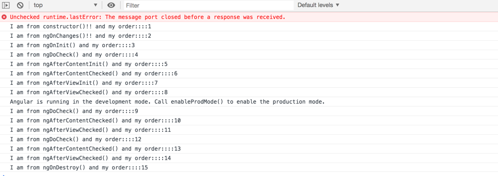 Ok. Bây giờ thì test với @Input footerText trong footer component để thấy sự thay đổi về thứ tự vòng đời nhé. Để ý là lần này thằng ngOnChanges() sẽ được gọi trước ngOnInit().