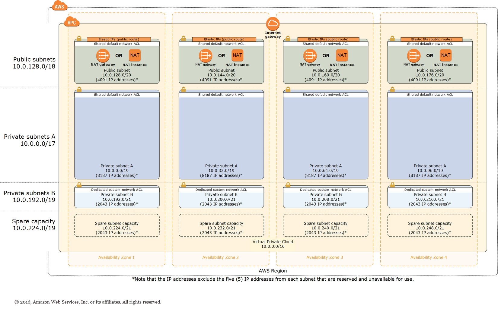 Các bạn có để ý thấy các mục ghi kiểu: Subnet 10.0.200.0/21 (2043 IP addresses). Các bạn có thắc mắc /21 là gì? Tại sao lại là 2043 IP addresses không? 10.0.200.0/21 vậy là cậu này dùng 21 bit đầu để đánh địa chỉ network rồi. còn 11 bit nữa để đánh cho các host trong network, -> số lượng các dãy số khả dụng sẽ là: 2mũ11 = 2048. Nhưng họ lại ghi 2043 IP addresses Google một lúc thì mình biết rằng AWS quy định 5 IP address cho mục đích khác rồi, nên chúng ta không được dùng nó nữa.
