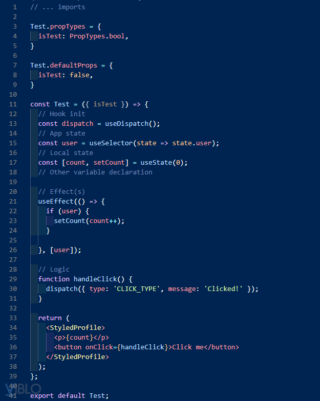 Theo thứ tự quan trọng thì effect là phần chúng ta muốn xem tiếp theo sau state để có thể biết được component này hoạt động như thế nào. Cuối cùng là logic. Với cách trình bày code như này chúng ta sẽ rất nhanh nắm bắt được mục đích của component này để làm gì?