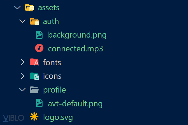 Ví dụ, file logo.svg sẽ được sử dụng ở bất kỳ đâu trong ứng dụng nên chúng ta sẽ đặt nó ở root của thư mục ./assets. Nhưng file avt-default.png chỉ được sử dụng trong container profile vì vậy nó sẽ được đặt trong thư mục ./assets/profile.