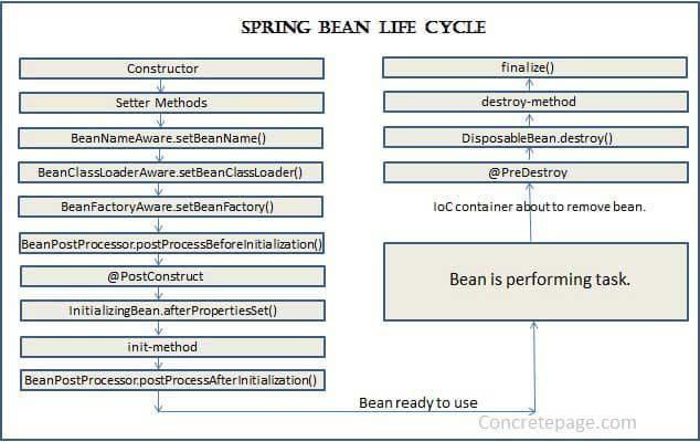 Vòng đời (life cycle) của bean được hiểu là từ khi bean được tạo ra cho tới khi chết đi, sẽ có những sự kiện (event) khác nhau xảy ra. Về vòng đời của bean có thể mô tả bởi sơ đồ sau.