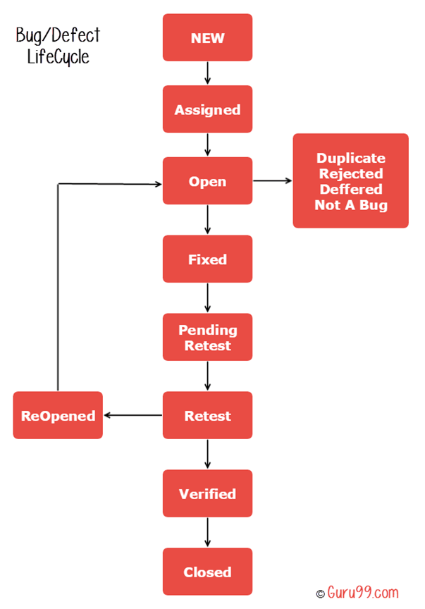 Các trạng thái của một bug/defect thường sẽ thay đổi tùy từng dự án. Dưới đây là sơ đồ vòng đời của một bug/defect, bao gồm tất cả các trạng thái có thể: