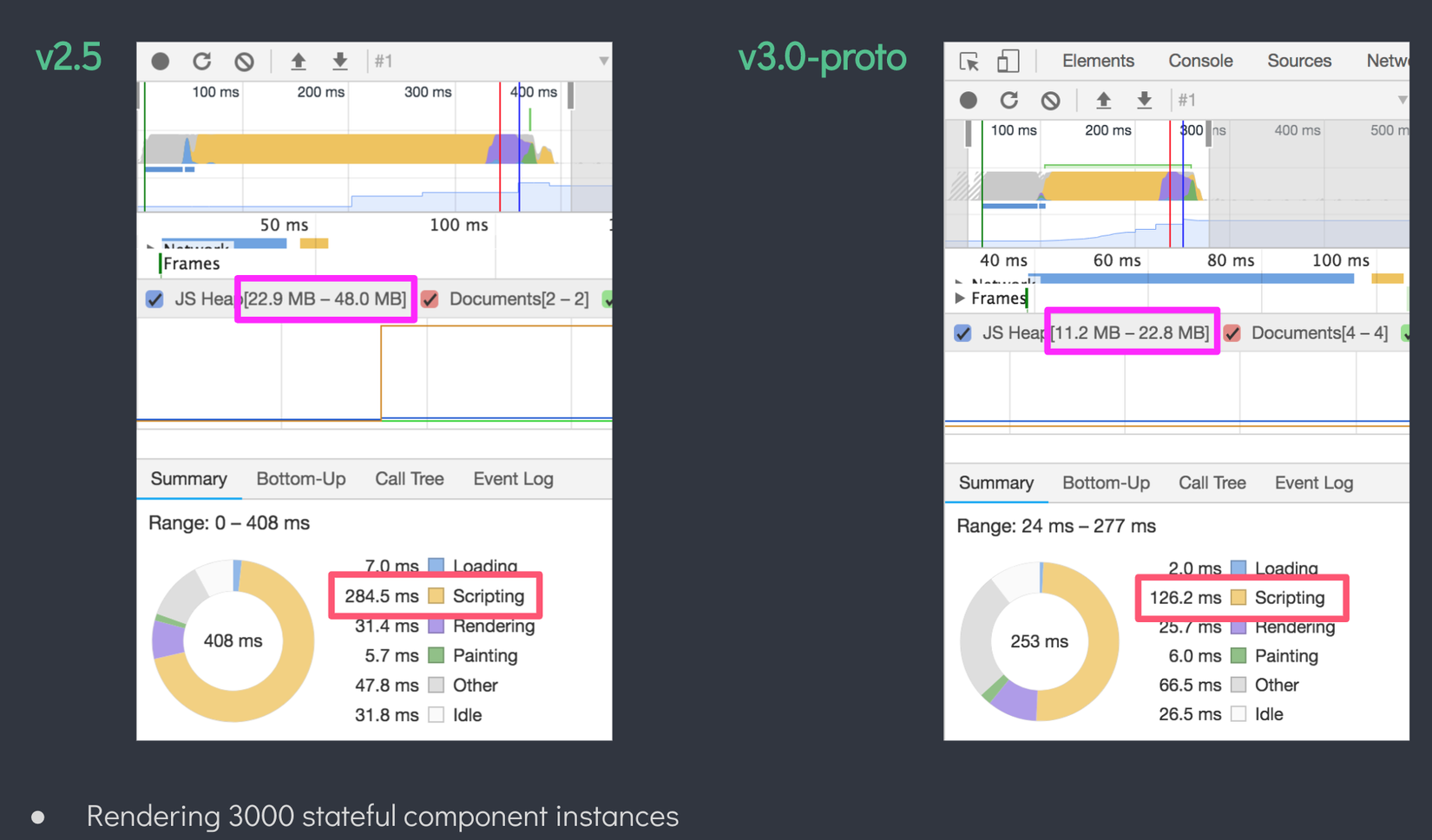 Trên đây là 1 so sánh giữa Vue 2 và Vue 3 do Evan You (creator VueJS) thực hiện, ta có thể thấy là build size đã nhỏ đi còn ngót 1 nửa, thời gian thực hiện code JS cũng giảm đi quá nửa.