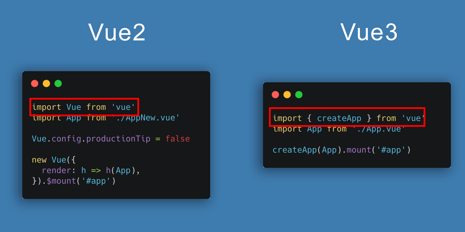 Như ở trên các bạn thấy là sự khác biệt là ở Vue 3 thay vì import cả thư viện Vue thì giờ ta chỉ import duy nhất module createApp để phục vụ mục đích hiện tại là tạo app Vue.