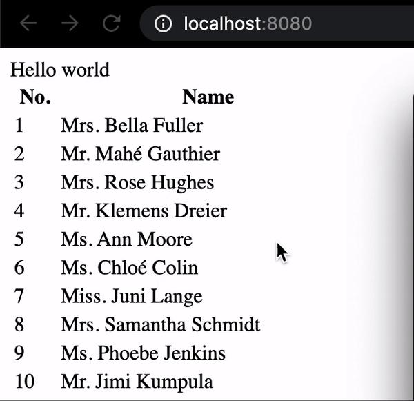 Ở đây các bạn thấy nội dung ta khá đơn giản: lấy về thông tin 5000 users, công việc này được thực hiện trong setup(), và cuối cùng là hiển thị nội dung bằng 1 table
