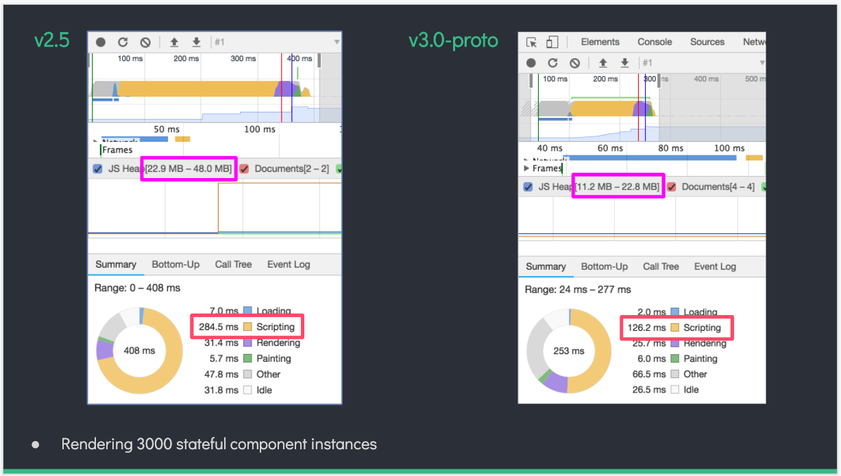Ở vue3 virtual dom(vdom là gì) sẽ được xóa và viết lại từ đầu, hiệu suất tăng thêm có thể lên tới 100% (so với v2) khi mounting (ban đầu) và patching (vá lại dom khi state update) Cộng thêm những tính năng hứa hẹn sẽ đưa tới performance tốt hơn cho Vue như :