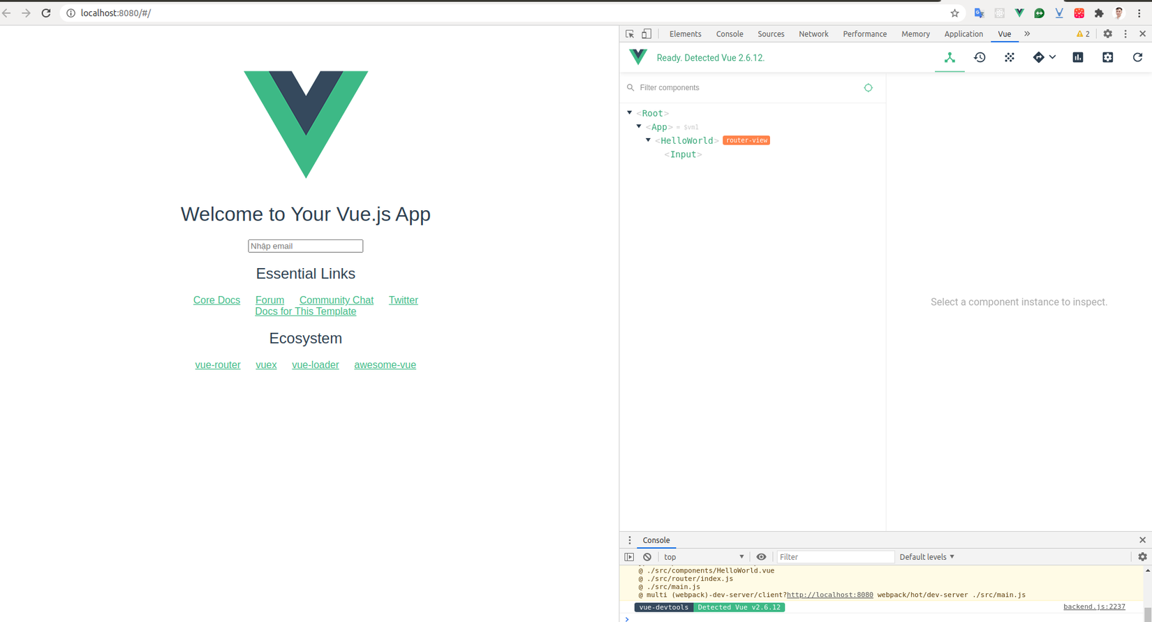 Chúng ta có 2 cái mới được thêm vào đấy là ô input khi hiển thị ngoài trình duyệt và thêm một node <Input> vào cây Component khi mở Vue Extension lên .