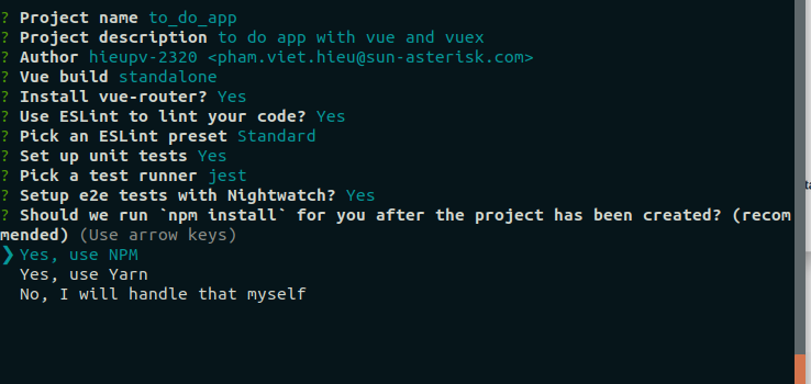 Các bạn có thể tùy chọn sử dụng Npm hoặc Yarn để chạy và quản lý các library. Nhưng mình đang dùng npm nên mình sẽ chọn sử dụng NPM luôn (Mọi người lên google tim hiểu thêm về Yarn nhé, nó cũng là một công cụ quản lý các thư viện trong javascript khả năng sắp thay thế cả npm  nghe nói yarn ổn định và tốc độ hơn npm ) .