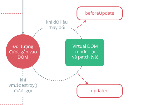- beforeUpdate hook : Sau khi đối tượng đã được gắn vào DOM, khi dữ liệu thay đổi, và trước khi render, patch lại và hiển thị ra cho người dùng.