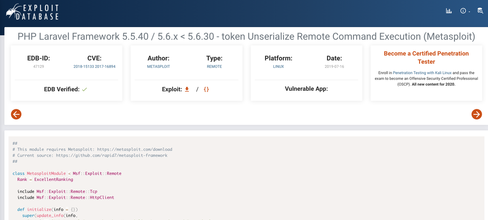 oops, ở đây phiên bản laravel là 5.5.41. Thử tìm kiếm lỗ hổng với phiên bản này, mình tìm được 1 mã khai thác của metasploit cho phép RCE.