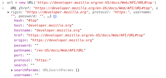 url = new URL('https://developer.mozilla.org/en-US/docs/Web/API/URL#top')