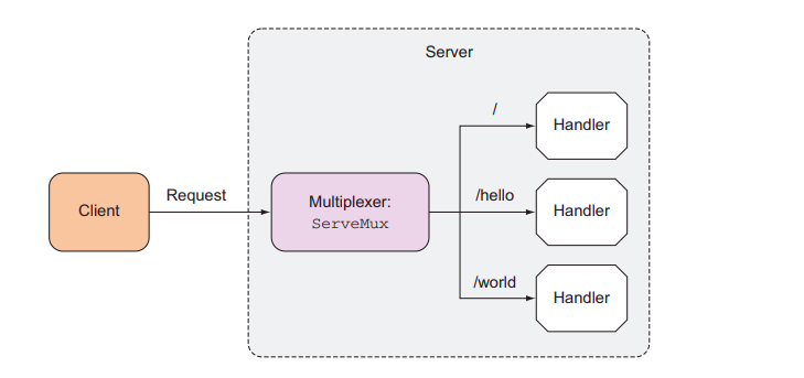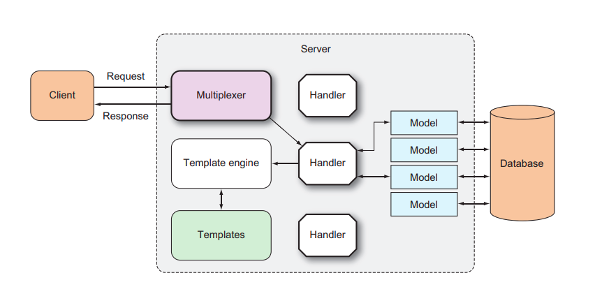 Request từ client đến server ban đầu sẽ phải đi qua một thành phần gọi là Multiplexer (tạm dịch là bộ ghép kênh). Bộ ghép kênh sẽ phân tích request (tùy vào url hay là method) và chuyển đến cho Handler thích hợp để xử lý tiếp. Các Handler sẽ là các hàm gọi Database, xử lý logic request tùy theo yêu cầu và trả lại dữ liệu cho Template để hiển thị ra (Template engine như trong Node.JS là ejs hay jade ...). Cuối cùng Multiplexer sẽ trả lại response cho client.