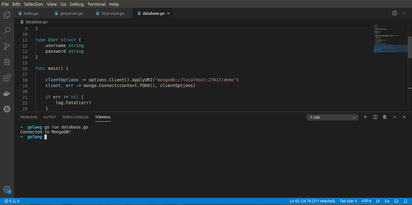 Chạy go run database.go và kết quả sẽ hiện ra nếu connect thành công