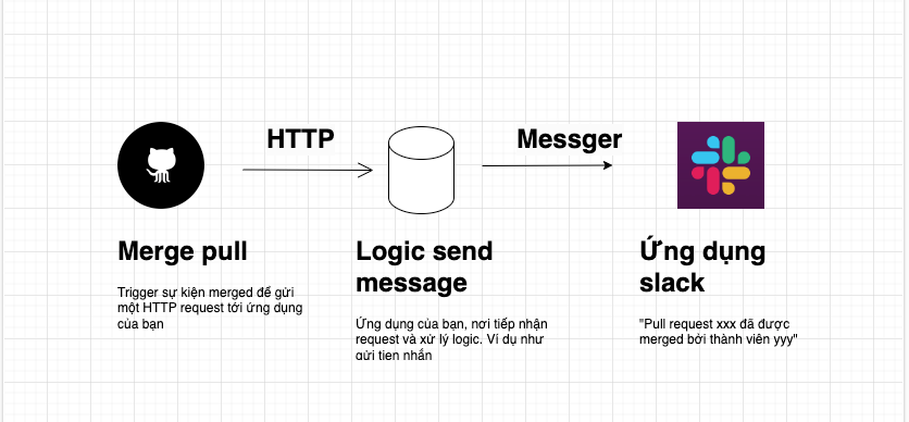 Hiểu đơn giản, Một webhook cho phép các dịch vụ bên thứ ba gửi các gửi các update theo thời gian thực cho ứng dụng của bạn. Khi các update được trigger(kích hoạt) bởi các event hoặc hành động do webhooks cung cấp và được push tới ứng dụng của bạn thông qua các HTTP requests. Khi bạn nhận được các request, bạn sẽ xử lí nó, ví dụ như gửi một tin nhắn về box Slack báo việc đã merge pull chẳng hạn.