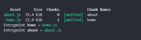 Ta có hai file output là about.js và home.js có dung lượng đều là 72.4 KiB