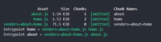 Xuất hiện file output  vendors~about~home.js điều này có nghĩa webpack đã tối ưu source code, thu gom những thư viện giống nhau ở đây là lodash, tên thì được remix giữa vendor (nhà cung cấp) với tên hai file
