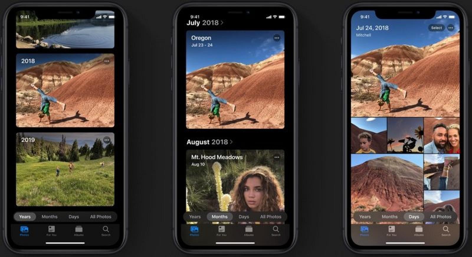 Trong iOS 13, tab ảnh chính trong ứng dụng Ảnh có giao diện hoàn toàn mới , đặt ảnh trước và trung tâm tốt nhất của bạn để bạn có thể sống lại ký ức trong nháy mắt. Ngoài ra tuỳ chọn để xem tất cả ảnh của bạn cũng dễ dàng hơn vì ảnh được sắp xếp theo ngày, tháng và năm. Chế độ xem ngày hiện thị ảnh bạn chụp trong hôm đó, trong khi xem theo tháng hiển thị ảnh được phân loại theo các sự kiện giúp bạn xem nhanh nhất và dễ dàng.