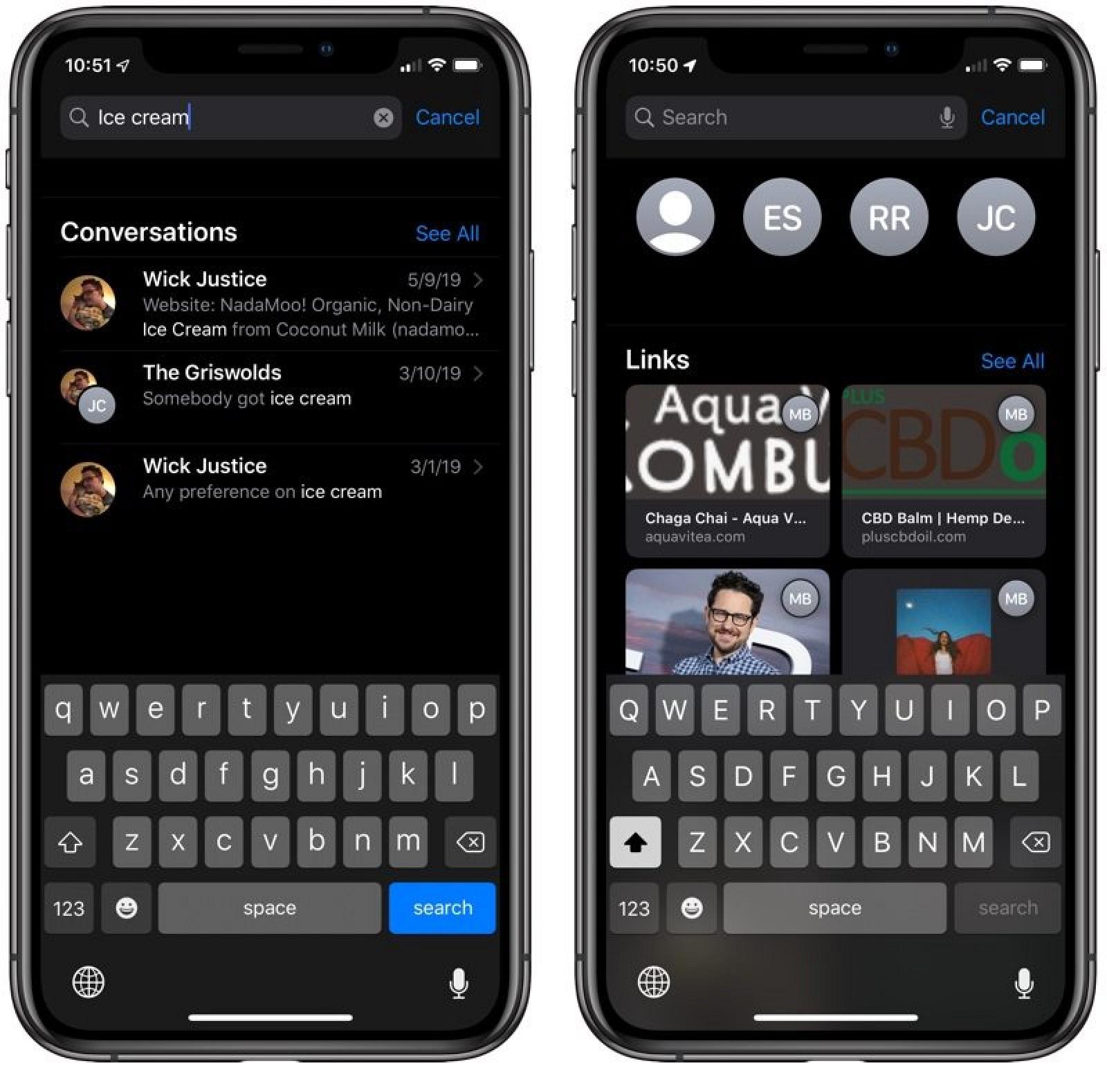 Tin nhắn cho phép bạn thêm tên và ảnh được chia sẻ với người khác khi bạn bắt đầu cuộc trò chuyện hoặc khi người khác trả lời trong tin nhắn. Bạn có thể chọn chia sẻ ảnh hồ sơ của mình với mọi người, danh bạ của bạn hoặc không. Ảnh hồ sơ có thể là hình ảnh, chữ lồng hoặc ký tự hoạt hình. Gần đây Apple đã cải thiện tìm kiếm trong Tin nhắn với màn hình tìm kiếm cung cấp các tin nhắn, người, ảnh, liên kết gần đây bạn đã gửi và vị trí. Khi tìm kiếm, Tin nhắn phân loại kết quả và đánh dấu các cụm từ phù hợp, với các mục gần đây nhất xuất hiện trước tiên. Ngăn thông tin, có thể truy cập khi nhấn vào biểu tượng "i" trong cuộc hội thoại, giờ đây được tổ chức tốt hơn. Nó cung cấp hình ảnh, vị trí, tệp đính kèm và liên kết đã được chia sẻ trong cuộc trò chuyện để bạn có thể tìm thấy những gì bạn đang tìm kiếm nhanh hơn.
