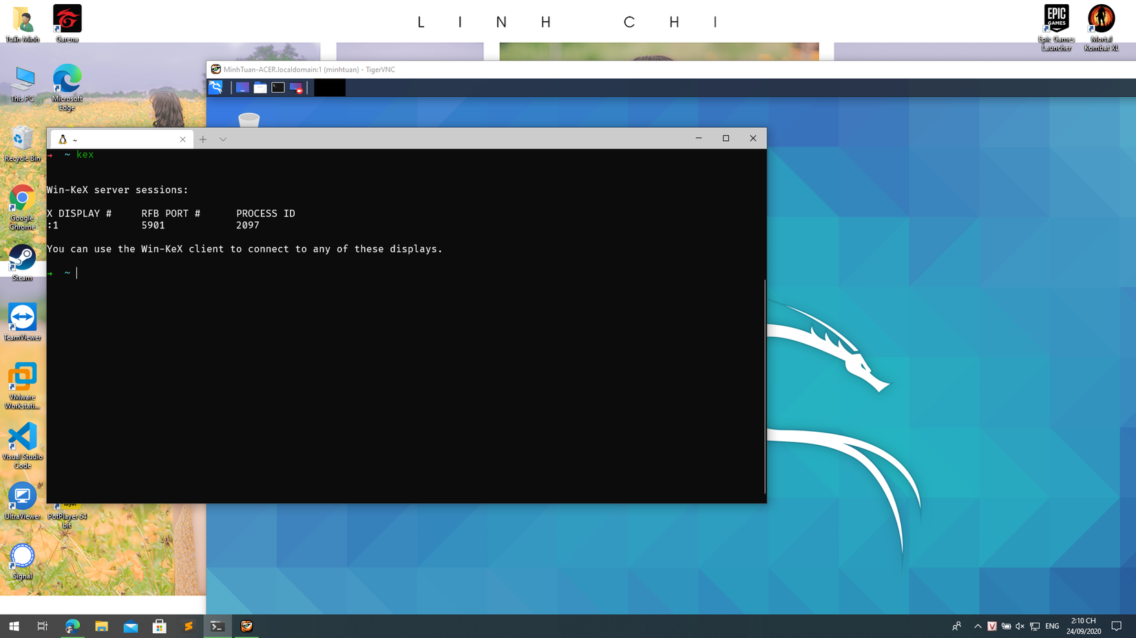 Sau khi cài đặt xong, các bạn có thể gõ kex vào terminal của kali là chúng ta có thể sử dụng giao diện của Kali Linux rồi.