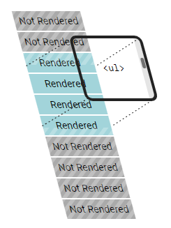 Giả sử, ta một có list chứa 10000 phần tử. Việc render tất cả mười ngàn phần tử này sẽ block UI và khiến cho web app của chúng ta bị đơ cứng trong vài giây. 10000 phần tử này, khả năng cao là vượt khỏi chiều cao/rộng của màn hình, và phải sử dụng thanh scroll để có thể nhìn thấy.