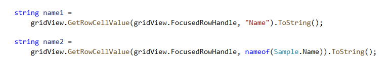 - Mình sử dụng tạo cột động của gridView khi gán DataSource. Cho nên trong trường hợp cần truy xuất 1 Cell bất kỳ của lưới sẽ sử dụng method nameof() của C# 6.0. Ví dụ: