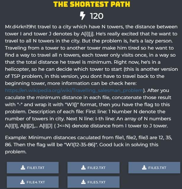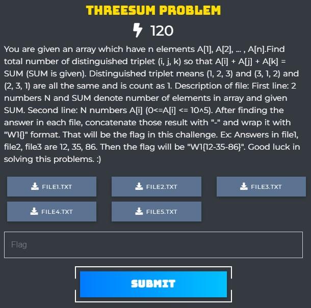 Chào mọi người, mình là Bích Sơn Nhật, sinh viên K17 thuộc khoa Công Nghệ Phần Mềm Trường Đại học Công nghệ Thông tin - ĐHQG TP.HCM. Dạo gần đây mình có tham gia cuộc thi CTF WANNAGAME FRESHMAN 2022 và đạt được thành tích với thứ hạng 29/59 đội với Team BirthdayCake, thành viên gồm có bichsonnhat (bản thân mình). Các mảng bên cuộc thi rất đa dạng (𝐂𝐫𝐲𝐩𝐭𝐨𝐠𝐫𝐚𝐩𝐡𝐲, 𝐏𝐰𝐧𝐚𝐛𝐥𝐞, 𝐅𝐨𝐫𝐞𝐧𝐬𝐢𝐜/𝐌𝐢𝐬𝐜, ...), nhưng mình không phải dân chuyên CTF nên chỉ quan tâm đến mảng 𝐏𝐫𝐨𝐠𝐫𝐚𝐦𝐦𝐢𝐧𝐠, và may mắn thay mình đã giải được 3 challenges trong vòng 2 ngày và đạt cả 3 FirstBlood. Hôm nay mình sẽ viết WriteUp cho Programming Challenge mà mình đã giải được gồm có : Threesum Problem, The Shortest Path, MITM.